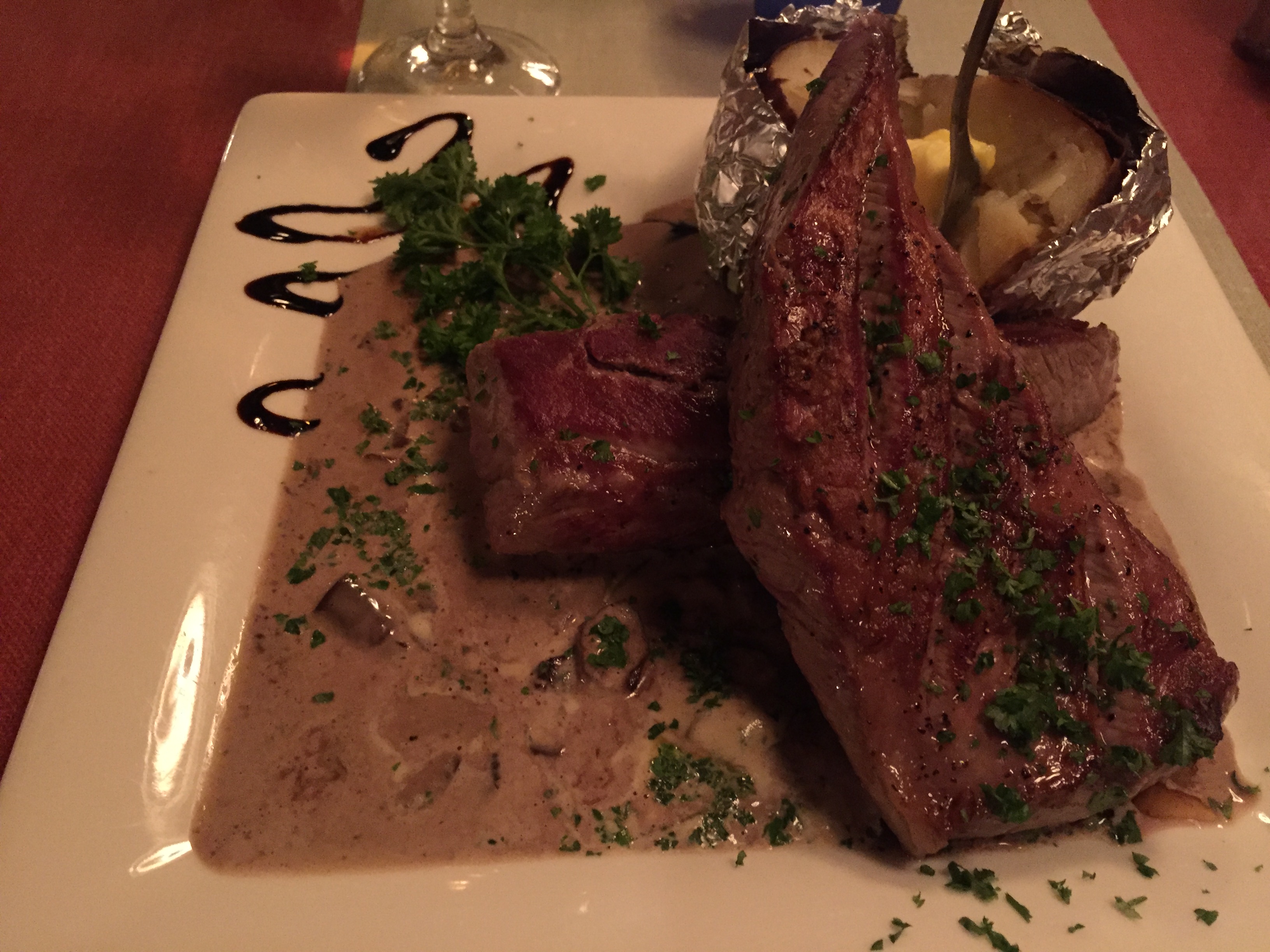Na het uitpakken van mijn spullen, heb ik even de stad verkend en heb gegeten bij een italiaans restaurant. Ben even de naam vergeten maar het eten was er uitmuntend. Ik bestelde een steak met gepofte aardappel en paddestoelen.